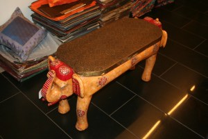 I still don’t understand how I was able to see it, under three cushions and a hanging carpet. But a flap of it caught my attention: a wooden elephant.