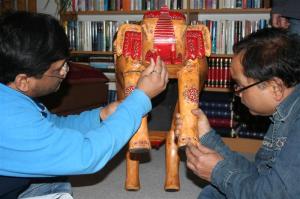 Finally, The Elephant is among us! It arrived on Friday, as promised by UPS. I was able to follow its journey from Mumbai to Frankfurt, via some – to me – unknown cities in Germany, Copenhagen, Malmø, Oslo and finally Stavanger. But, sadly, some damages were there. Anyway, nothing that couldn’t be fixed, I estmated! So I invited my friends Ram and Prem for an inspection, and they went to work with a determined attitude. And yes, elephant is as good as new. or as good as old…. And again very beautiful! (But I ill have to make a complaint about the way of packing…..)