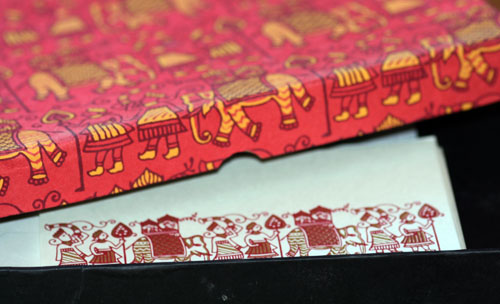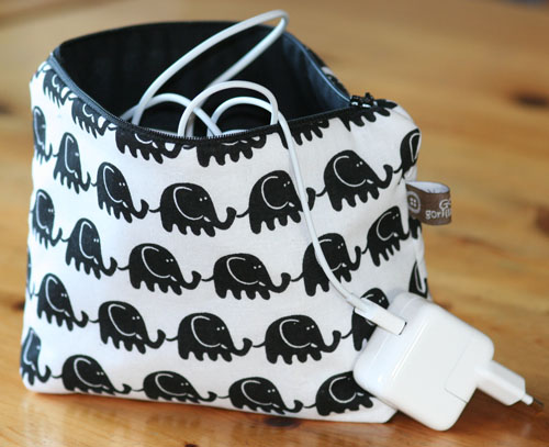 Elephant illustrations can be very ornamental, in gold and red with that typcal ‘touch of India’. But simplified patterns seems to be very modern these days. Like my ‘Apple pouch’ for my Apple remedies; which are the chargers for my Apple devices. When travelling these days one has to carry so many things one even didn’t have to think about ten years ago. Various chargers are not to be forgotten and better keep them in one place!