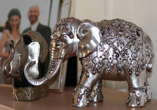I try to keep my elephants small, but there are some medium sized… Like the small “silver” family which is guarding the wedding portrait of Ida and Erik. And then there is Prem and Ooty who is sharing our meals with us every day. Prem was bought in Dehli, a nice brown specimen from the shops by The Red Fort. It was my good friend Prem Singh who made the bargain… Ooty was bought in…. Ooty (state of Tamil Nadu) last November. A very nice specimen with beautiful ornaments!