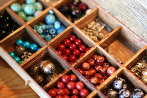 The challenge with making jewellery of beads, is that you need a lot…. Because there is always something “missing”. Too few of the same kind, for example. Not the right colours – when you just got an idea of a colour combination or a special design. The wrong size…. Not enough metal beads, often used in between other beads to create a vintage look. And so on and so on… And right from the outset, you need basic tools. String, or wire and locks.