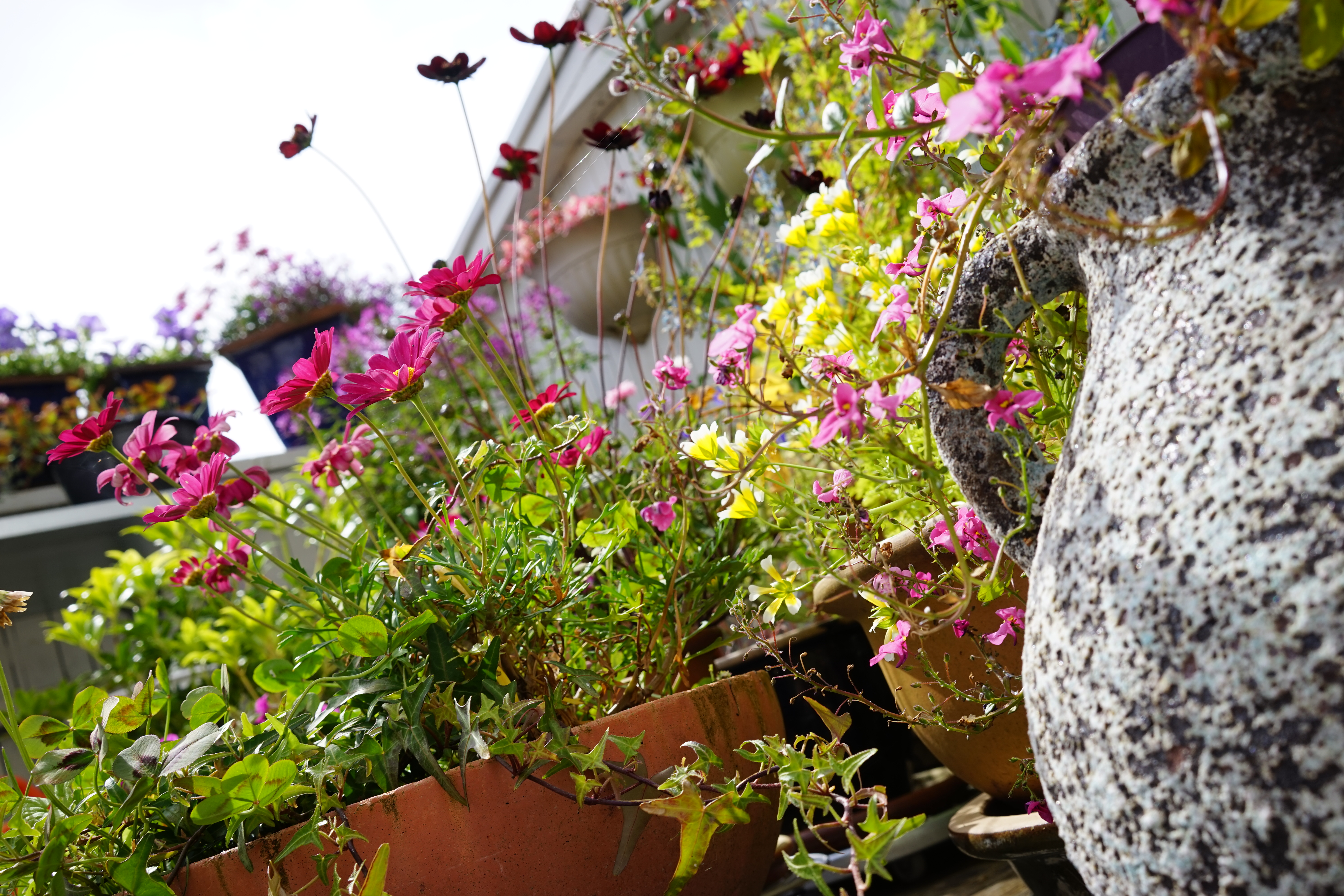 The right corner of my terrace has been a symphony in pink this summer. I love to sit here and just watch, admire rather. If it were early spring I would think out new ideas, leap to my feet, rearrange some pots, and then sit down. Whereas now, I let everything be. Some flowers are gone. I have trashed them without sentimentality, the black soil is gaping at me.