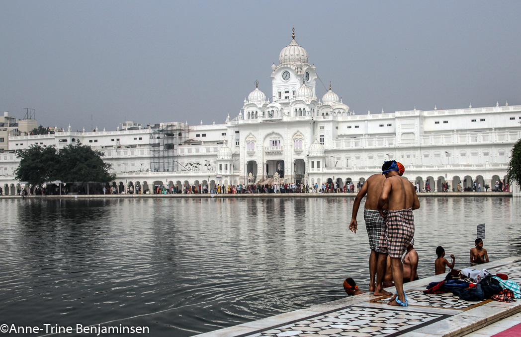 Afterwards, we sat down under the archway. Leaning towards the wall, we did some serious people watching. In between, we all – I believe – closed our eyes and let the chanting music lull us into a light after lunch nap. The temple, separated by the sparkling water, shone in all its glory. People were floating by in a steady, endless stream: stately and well-dressed Sikhs in a variety of coloured turbans, equally colourful women in their best Punjabi dresses, people in various headscarves, a few children here and there. A small crowd of young men were dipping their bodies in the water. I remember the old woman with her husband bent double in a wheelchair, maybe his first, or last, visit to the Golden Temple. I was enchanted by all the bright colours towards the white, marbled landscape and drifted in and out of silent appreciation.