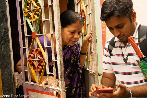 I have always been intrigued by the colours of India, be it the colourful and bright female clothing or pastel-coloured houses. The winding roads, or paths, rather, going uphill are lined with pink, turquoise, yellow, light blue and green little dwellings. Some house small trades, like the one we peep into where a man is busy ironing. And who knows what else is hidden behind all the doors? We spot at least one beauty salon. Money has always been made just about everywhere in India.